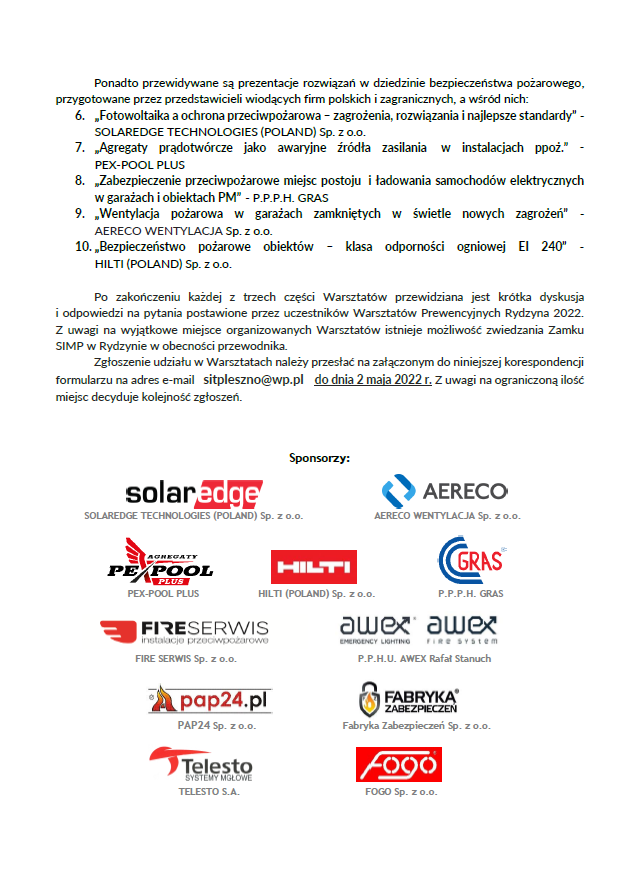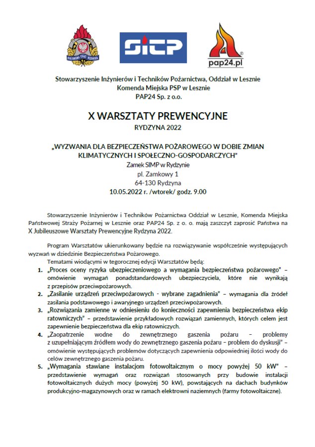 Stowarzyszenie Inżynierów i Techników Pożarnictwa Oddział w Lesznie, Komenda Miejska Państwowej Straży Pożarnej w Lesznie oraz PAP24 Sp. z o. o. zorganizowali X Jubileuszowe Warsztaty Prewencyjne Rydzyna 2022, pt. „Wyzwania dla Bezpieczeństwa Pożarowego w dobie zmian klimatycznych i społeczno-gospodarczych”.